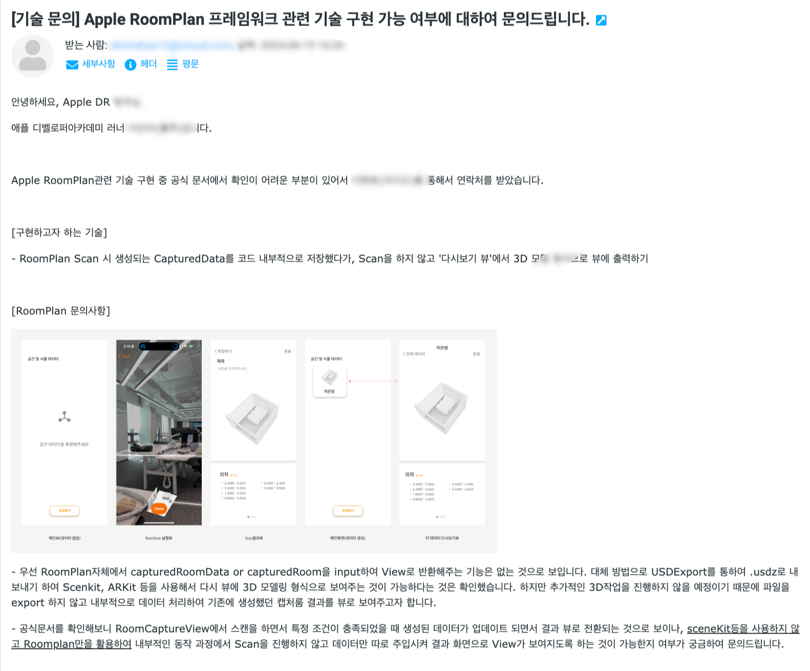 현재 사용하는 프레임워크가 제공하는 기술에 따라 UIKit의 UIView로 반환되는 것을 SwiftUI의 view로 로 바꿔주기 위해서 UIViewRepresentable을 사용하고 있었다. 따라서 Roomplan 관련 기능을 처리하는 Class를 @StateOvject로 변화를 관찰해주고, 변화가 있으면 자동으로 실행되는 UupdateUIView()의 코드에서 captureview(data:)에 업데이트된 데이터를 넣은 뒤 View로 반환해주도록 수정을 하고 테스트를 해보았다. 어머어머!!! 생각한 흐름대로 실행이 되었고 프로젝트의 메인 기능 2개를 무사히 구현할 수 있었다. 기술을 구현했다고 생각한 것은 착각이였다.... 마지막으로 스캔된 결과에 해당되는 3D 평면도만 보여줄 수 있고, 스캔을 진행하지 않고 임의로 내가 원하는 원시데이터 혹은 3D 데이터를 저장했다가 3D 평면도로 보여줄 수는 없었다. 여러가지 가능성을 모두 테스트해보았고, 뷰에 다른 데이터들은 정확하게 넘어가는 것을 확인하면서 불가능한 기술인 것 같다고 짐작했다. 이런 상황을 멘토에게 문의하였고, Apple DR의 연락처를 받게 되었다.